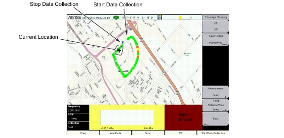 5. Press the Start Data Collection main menu key. Data will be collected at the time or distance interval based on the setting in Point Distance/Time Setup Menu. The color of the squares indicates the power level based on the RSSI setup.