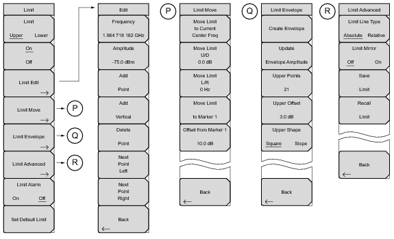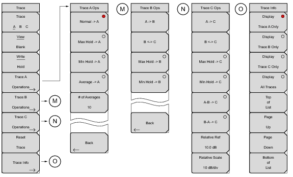 Figure 6‑10 though Figure 6‑15 show the map of the Spectrum Analyzer menus. Refer to Spectrum Analyzer for the details of the menus and associated submenus.Coverage Mapping Menu describes the details of Coverage Mapping (Option 431) menus and associated submenus.