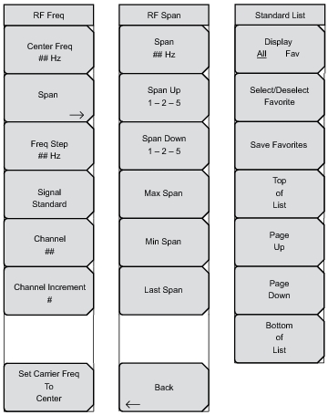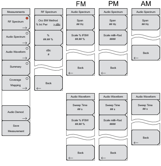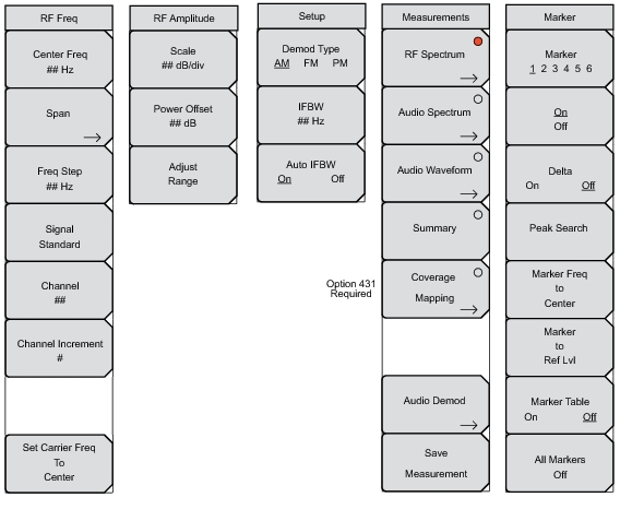 AM / FM / PM Analyzer MenusThe AM / FM / PM Analyzer controls are accessed in the menus. The menus that are opened by the 5 main menu keys are shown Figure: Main Menus with AM / FM / PM Analyzer (Option 0509).