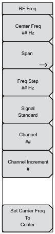 Press to open the Span menu (“RF Span Menu” on page 7‑11). The Span menu is used to set the frequency range over which the instrument will sweep. The span can be set from 10 Hz to the maximum frequency range the product will support. See the product specifications for the maximum frequency. Span can also be set to zero span.