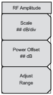 Amplitude Menu Key Sequence: Amplitude Amplitude Menu Scale Press to set the scaling factor in dB per division. Use the rotary knob, the arrow keys, or the numeric keypad, then press the Enter key. Power Offset Press to set the power offset in dB. Use the rotary knob, the arrow keys, or the numeric keypad, then press the Enter key. Adjust Range Press to change the reference level if the signal strength is too high (ADC error) or too low.