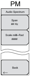 Audio Spectrum PM Menu Key Sequence: Measure or (Shift + 4) > Audio Spectrum > Audio Spectrum Audio Spectrum PM Menu Span Press to set the PM audio spectrum span. Use the numeric keypad, the rotary knob, or the arrow keys to set the value. Valid values are 2 kHz, 5 kHz, 10 kHz, and 20 kHz. Scale milli-Rad Press to set the scale in milliradians. Use the numeric keypad, the rotary knob, or the arrow keys to enter a value. Back Press to return to the Measurements menu.