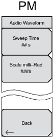 Audio Waveform PM Menu Key Sequence: Measure or (Shift + 4) > Audio Waveform > Audio Waveform Audio Waveform PM Menu Sweep Time Press to set the sweep time. If you use the numeric keypad to enter a value, then the submenu keys change to Time in units of s, ms, µs, ns, or ps. Scale milli-Rad Press to set the sweep scale in milliradians. Use the numeric keypad, the rotary knob, or the arrow keys to enter a value. Back Press to return to the Measurements menu.