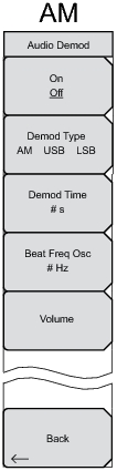 Press to select the type of desired demodulation: AM, USB, or LSB. The selection toggles through the choices, and the current setting is underlined on the submenu key.