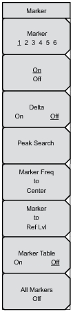 Press to turn On or Off the marker table, which is displayed below the sweep window. The table is automatically sized to display all markers that are turned on. In addition to the marker frequency and amplitude, the table also shows delta frequencies and delta amplitudes for all markers that have deltas entered for them. The current setting is underlined on the submenu key.