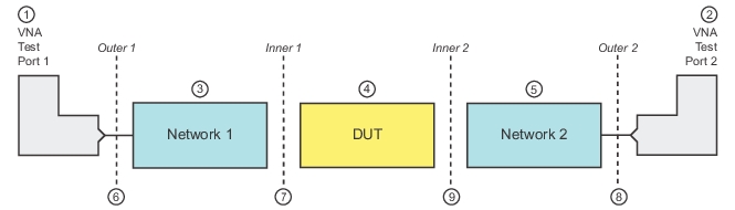 Type C is the most complete, dual fixture extraction approach offered in the VNA. It requires full 2-port calibrations at two sets of reference planes but can fully determine the S-parameters of two networks independently.