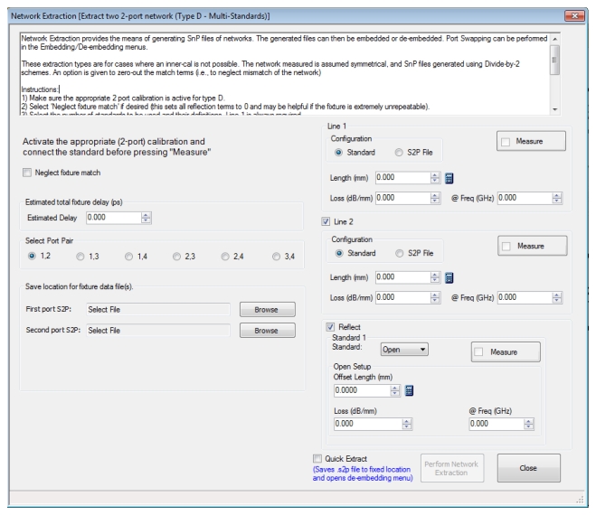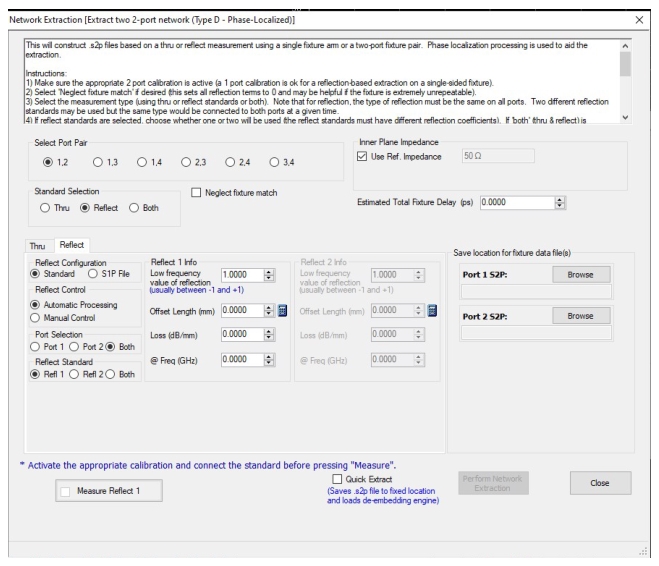 If the assumptions are met, this method can outperform the previously discussed Type D variations. More central to this method is the fixture length as transmission-line-like: functions are cross-correlated with the measured data to better isolate insertion loss and reflection coefficients of the fixture halves. If the fixture length entry is set to zero, an automatic process (much like auto reference plane delay discussed in Calibration and Measurement Enhancements of this guide) will estimate the length. As before, entries for the line length or reflect offset length are required and any errors in those values will translate to extracted parameter phase. If the line is chosen as the standard, symmetry between the fixture halves in terms of insertion loss will be assumed. If the reflect standard is chosen, no symmetry is assumed and only one half of the fixture can be extracted if desired. If both halves are to be extracted, length estimates for the individual arms can be entered. In this variation of Type D, there is no Measure button and the measurement is executed when Perform Network Extraction is selected.