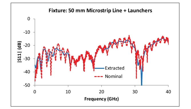 In a (thru-based) phase-localized D extraction, inner plane impedance deviations can create issues if large enough. In this case, the inner plane was at 25 ohms while the launch (and reference impedance for the calibration) was 50 ohms. If the impedance change was ignored (red squares in the plot), the extracted return loss for the fixture half can be significantly in error.