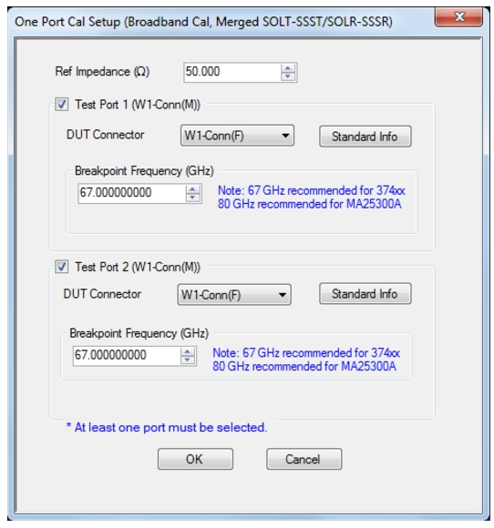 At least one test port (Test Port 1 or Test Port 2) must be selected. Both test ports may be selected.