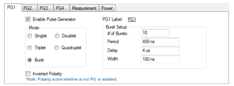 1. Pulse Measurement: Width = 5 µs Start = 3.5 µs Stop = 8.5 µs 2. Pulse Synchronization Signal: Set to Internal 3. Pulse Generator 1 (PG1): Singlet Mode 6 µs Delay, 1 µs Width 4. Pulse Generator 2 (PG2): Doublet Mode 4 µs Delay 1, 1 µs Width 1 6 µs Delay 2, 1 µs Width 2 | 5. Pulse Generator 3 (PG3): Quadruplet Mode 2 µs Delay, 1 µs Width 4 µs Delay, 1 µs Width 6 µs Delay, 1 µs Width 8 µs Delay, 1 µs Width 6. Pulse Generator 4 (PG4): Burst Mode # of Bursts: 10 Period: 400 ns Delay: 4 µs Width: 50 ns |