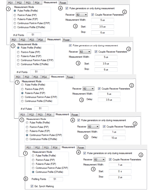 1. Set the measurement mode (the measurement mode is a per-channel setting that applies to all receivers). 2. Select the receiver and check if the measurement parameters are to be applied equally to all receivers. 3. Set the measurement parameters on a per-receiver or coupled basis. 4. When the Measurement tab is selected the Pulse generators on only during measurement toggle selection is only visible when measurement mode is Pulse Profile or Continuous Profile. Selecting this feature allows pulse generators to start up only when a measurement is taken. 5. In Continuous Profiling mode there is a concept of profiling points which is the number of displayed analysis points. This can be greater or less than the # of sweep points. |