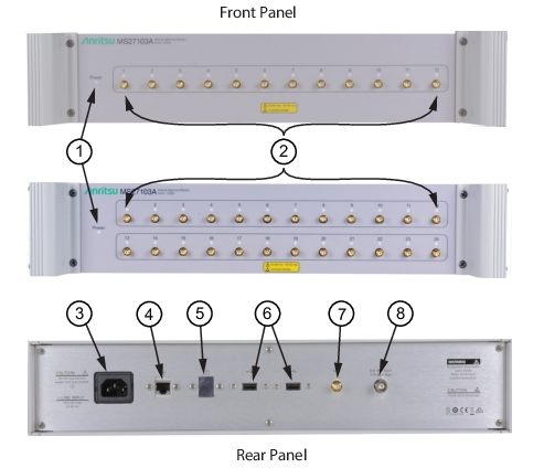 The MS27103A front panel connectors are identified in Figure: MS27103A.