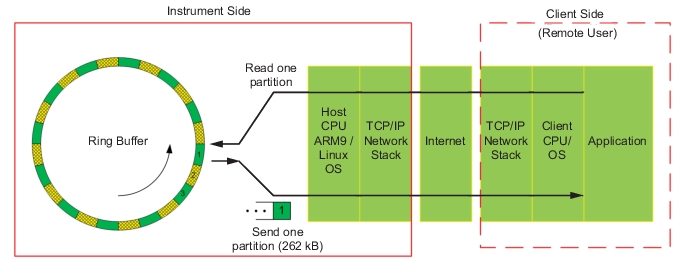 When the I/Q is sent out from the memory to the remote user, the data flow rate has to be managed. The simplest way to manage the data flow is to send out one partition and wait for a read command from the remote user before sending another partition. The user may not be able to receive all the partitions if the read command for each partition is delayed due to latency in the CPU, OS, network, and user application. The I/Q data is continuously filling the memory partitions at a rate proportional to the selected I/Q capture bandwidth. If the read command arrives after the start of a partition, that partition is skipped and will not be sent. The next partition will be sent instead.
