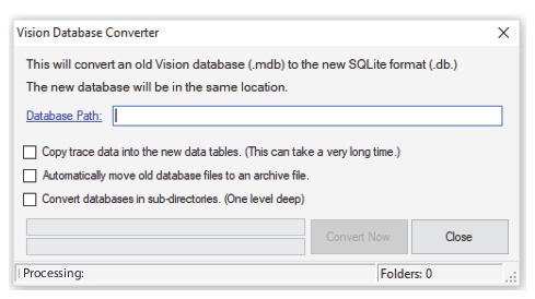 "Older versions of Vision (2018.9.1 and earlier) used a different database format. If you have archived data files and want to recover that data, you will need to convert the database to the newer format. To convert your data, use the Vision Database Converter. This can be launched from the Utilities|Settings menu page." If you choose to continue to update Vision software, a Vision Database Converter will appear as shown in Figure: Vision Database Converter Dialog.
