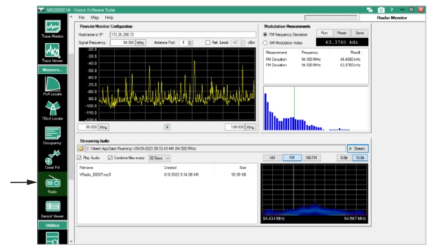 • Click on the peak to select the frequency for the audio streaming