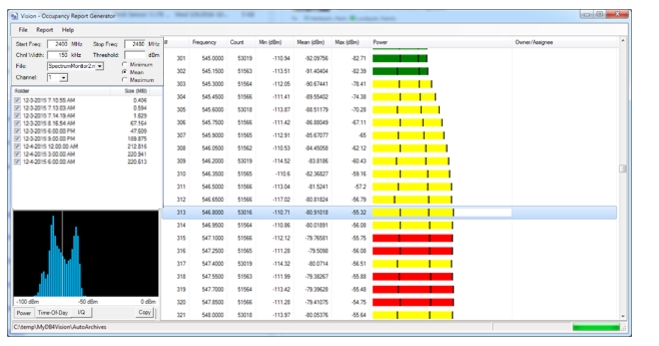 An occupancy report divides up a frequency range into sub-channels and shows the typical traffic at each sub-channel frequency. Occupancy reports are: