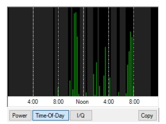 Click Time-Of-Day button to view the histogram of the time-of-day power readings for the selected sub-channel as shown in Figure: Time-of-Day Power Histogram. The gray shading indicates there is no data available during that time. If it is black, no shading and no bar, then there are traces at those time, but everything was below threshold.