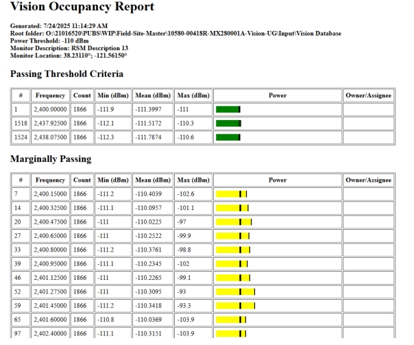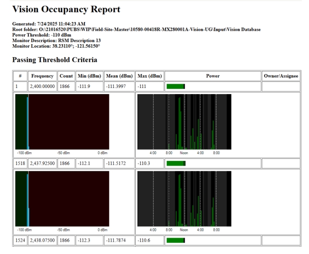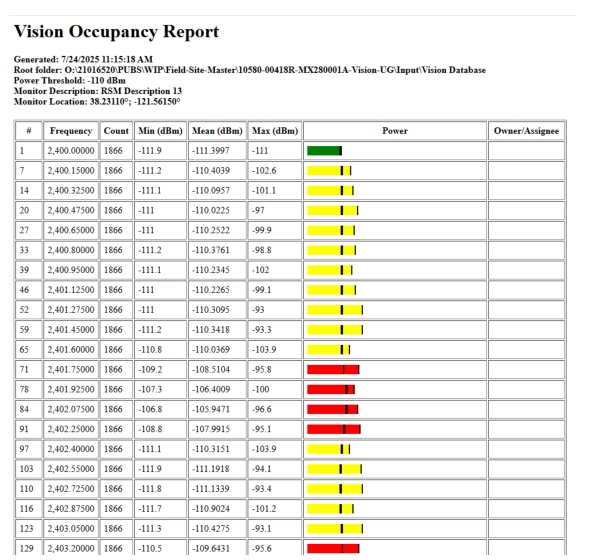 The last column in the Occupancy Report shows the assigned owner’s name for each sub-channel. This is for reference. This column can be edited by clicking in the column and typing the desired information. An Owner List must be loaded each time you generate a report, as the report comes directly from the database, which does not contain information about channel assignments or ownership. To load Owner/Assignee list go to File menu and select Load Owner/Assignee List. If you have edited the owner/assignee list in the currently generated Occupancy Report, be sure to click Save Owner/Assignee List from the File menu before closing the window or generating a new report, otherwise, your edits may be lost.