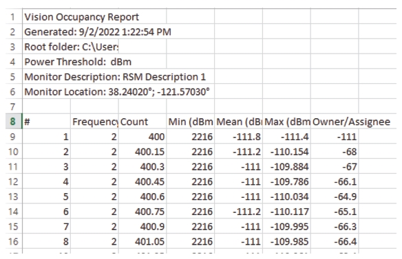 Determine the frequency range of interest and then collect trace data in that frequency space. The spectrum analyzers can collect up to 4000 points per trace. You will need to set the number of points such that you have at least one point/sub-channel. If you have more than one point/sub-channel, the highest measured power in the sub-channel is used in the report. For instance, if you are interested in monitoring the 500 MHz to 600 MHz, and you want 25 kHz channel spacing, then you will need at least (600 MHz – 500 MHz)/25 kHz = 4000 trace points.