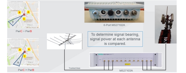 Directional antennas are used by the AoA algorithm to computer bearing lines. Power is automatically measured at each antenna port, where calculations are made based on received signal strength.