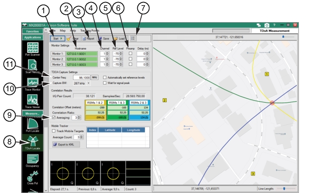 To use TDoA, verify the spectrum analyzers are installed with Option 400 and 401. Click the TDoA menu button to display the TDoA menu as shown in Figure: TDOA Settings and Control. See TDoA Locate (Option 401) for more information regarding the TDoA menu.