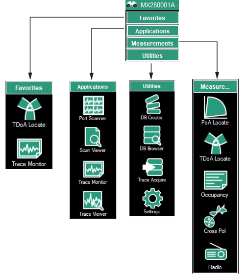 1. Favorites Menu - See Favorites Menu. 2. Applications Menu - See Applications Menu. 3. Utilities Menu - See Utilities Menu. 4. Measurements Menu - See Measurements Menu. |