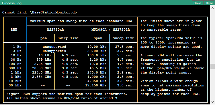 Max. Frequency Span Provides a Frequency-Span-Sweep Time conditions table in the Process Log window. SeeMaximum Frequency Span. |