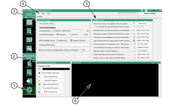 1. Settings Menu 2. Monitor Command and Control 3. Applications Settings 4. Menu Bar 5. Database Utilities 6. Process Log |