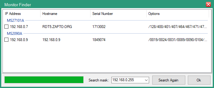 When searching for units, you must specify the subnet to look in. Many PC's have multiple network interfaces installed, such as LAN, Wi-Fi, VPN, etc. If multiple interfaces are detected, the appropriate search mask is added to the drop-down list. Select the correct subnet search mask to locate your remote monitors. You can often determine which mask is correct by looking at the first two segments. As an example, in the figure above the selected mask begins with "192.168.". This is selected because it is known that the remote monitors are on the subnet with IP addresses that begin with "192.168.".