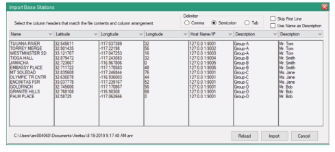 Find and open the list (.lst) file. You see the Import Base Stations screen populate as shown in Figure: List Created of Base Station Details. By clicking the “Skip First Line” check box will hide the first line of context, which in this case is “This is a sample list of Base Station locations, descriptions, and coordinates.” Click the delimiter chosen in the created list with one of the three radio buttons provided on the “Import Base Station” screen. In the example, each line is separated by a comma.