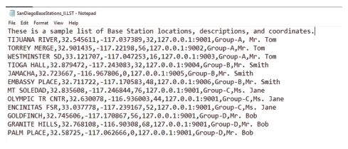 To create a list to import, use a text editor such as Notepad to enter the base station information. Refer to Figure: List Created of Base Station Details. Use a comma, colon, or a tab as the delimiter to separate the column entries. Store the list in a retrievable file location with the extension (.lst).