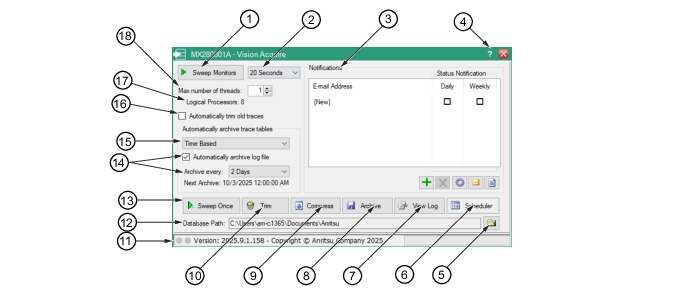 1. Sweep Monitors/Stop Sweeping Button 2. Sweep Monitor Time Setting 3. Email Notification Window 4. Help 5. Open File Folder 6. Scheduler 7. View Log 8. Archive 9. Compress | 10. Trim 11. Monitor Process Status Indicator 12. Database Path 13. Sweep Once 14. Automatically archive log file check box, Archive every/ Next Archive date and time 15. Automatically archive trace tables (Time Based) 16. Automatically trim old traces check box 17. Logical Processors Readout 18. Max number of threads drop-down |