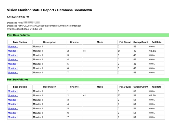 Figure: Generate Failure Report. This report contains data sections of accumulated failures from the Last Pass, Past Hour, Past Day, Past Week, and Past Month. Each section provides: