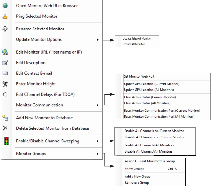 Monitor Groups | Monitor Groups Click to open the groups submenu. Click the appropriate command shown below: • Assign Current Monitor to a Group: Add a Spectrum Analyzer to a group. • Show Groups: Display the list of groups. • Add a New Group: Add a new group to a current list or start a new group. • Remove a Group: Remove a group of Spectrum Analyzers from the list. Monitors can be assigned into groups. Groups are used only to visually arrange the Spectrum Analyzers so that associated Spectrum Analyzers are together in the Spectrum Analyzer list. By default, the Spectrum Analyzers are listed in the order they are entered into the database. To place the Spectrum Analyzers in groups, use the Spectrum Analyzer context menu to add and assign groups. You also must toggle the Show Groups setting on to see the grouped Spectrum Analyzer list. Individual groups can be collapsed or expanded to easier view just the Spectrum Analyzers that are of interest at a particular time. For more on Spectrum Analyzer groups, see Base Station and Channel Directory. |