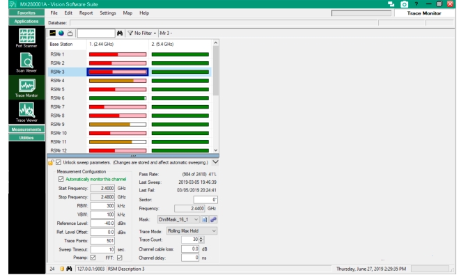 Figure: Monitor Map. The blue pins displayed represent the active on-line base stations in the Base Station and Channel Directory window. The red background for the Spectrum Analyzer name indicates the Spectrum Analyzer is off-line. On the map, its corresponding marker icon is red. The yellow background indicates the Spectrum Analyzer is on-line, but in use by another user. On the map, its corresponding marker icon is yellow.