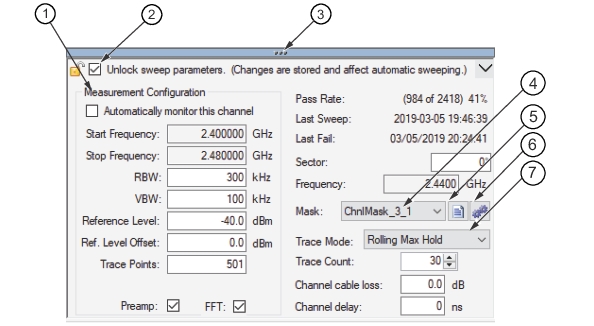 Measurement Configuration contains the setup parameters of the Spectrum Analyzer in the field. To change the parameters of the Status Panel, check the Unlock sweep parameters check box. If desired, they can be changed in their respective edit boxes.