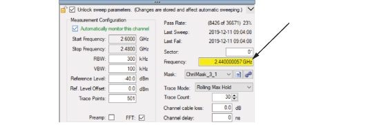 The center frequency of the transmission band. This Frequency window highlights yellow when the frequency is not set within the Start and Stop frequency range as shown in Figure: Highlighted Frequency Window.