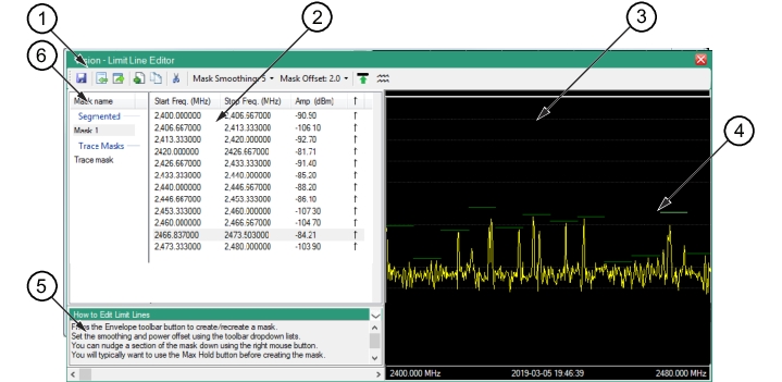 The Segmented toolbar and Trace toolbar have different icons. This description describes using the limit line editor for segmented masks. The toolbar changes when editing trace masks. See Trace Mask to create trace mask limit lines.