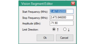 ![]() | Add new segment to current limit line Click opens Vision Segment Editor. Type a new Start Frequency, Stop Frequency and Amplitude in their respective entry boxes. Click the desired Limit Direction; Arrow up indicates above the RF spectrum or arrow down indicates below the RF Spectrum. Then click Ok. Clicking a line segment from the list will also provide the Vision Segment Editor. |