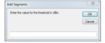 ![]() | Fill all gaps with new segments at set amplitude Click to open a dialog box as shown below. Type the value for the new threshold in dBm. Click OK and the added segment line(s) will fill all gaps in the trace window at selected dBm. Each added segment will also appear in the segment list. ![]() |