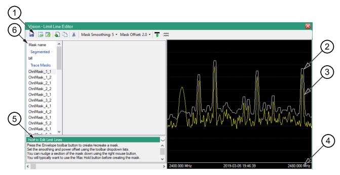 1. Toolbar 2. Mask Limit Line 3. RF Signal | 4. Trace Scrollbar 5. How to Edit Limit Line Dialog 6. Masks List |