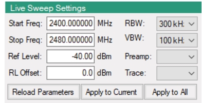 Set Resolution Bandwidth (RBW) for live sweeps. Pull-down provides RBW of 1 Hz, 3 Hz, 10 Hz, 30 Hz, 100 Hz, 300 Hz, 1 kHz, 3 kHz, 10 kHz, 30 kHz, 100 kHz, 300 kHz, 1 MHz, and 3 MHz.