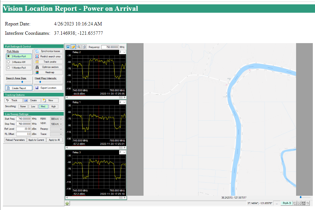 The report generated is shown in Figure: PoA Report. The report includes a screenshot of the PoA screen, Report Date, and the Interferer Coordinates. The report can be printed and saved in a user designated folder.
