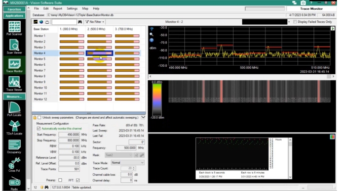 Up to three Spectrum Analyzers can be selected in the Trace Monitor menu. The red-boundary measurement window encloses the three Spectrum Analyzers selected.