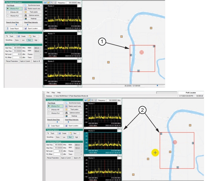 Refer to Figure: Change PoA Monitor. The selected Spectrum Analyzer from Trace Monitor is displayed on the screen as Spectrum Analyzer “1” on the PoA map. As default, the closest two Spectrum Analyzers are shown and labeled as Spectrum Analyzer “2” and Spectrum Analyzer “3”. These are the three Spectrum Analyzers initially set to measure the interferer signal. The three Spectrum Analyzers are enclosed in a red-boundary capture range rectangle used to calculate the interferer location.