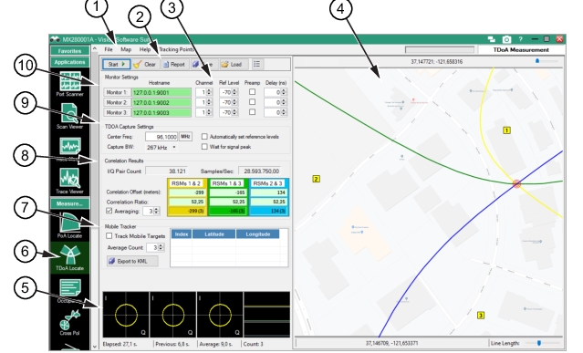 Typically, a map is loaded from an existing user file. The TDoA Application Graphical User Interface provides the approximate location of the simulated Spectrum Analyzers along with a series of locations that are used to simulate RF sources. These RF source locations can represent: