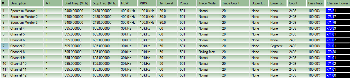Channel Span | Channel Span displays the individual channel spans when Split Frequency Range is checked. So in the Split frequency range example above, it will be blank if Split Frequencies is not checked, and show 10 MHz if Split Frequencies is checked. |