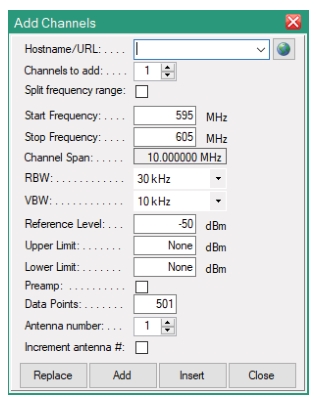 Split frequency range | The frequency span is split into the sub-channels. For example: Start Frequency is set at 600 MHz and Stop Frequency set at 700 MHz with 10 channels to add. • If Split Frequency Range is not checked, 10 channels set at 600 MHz to 700 MHz. • If Split Frequency Range is checked, 10 channels each with a 10 MHz span. 600 MHz to 610 MHz, 610 MHz-620 MHz, etc. |