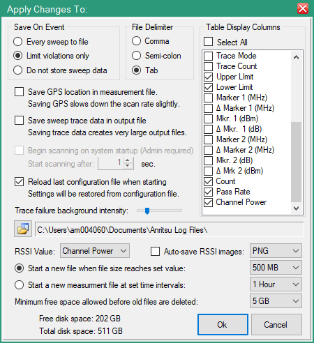 Select from the pull-down: JPG, PNG, GIF or BMP. The images are saved at a user defined rate as determined by the sweep time interval and the RSSI collection rate. For example, start scanning at a 3600 second rate with a sweep interval set to 1 will save an image after 1 hour.
