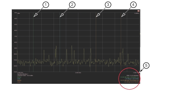 Figure: Markers/Delta Markers Displayed shows two positioned markers and their delta marker. Frequency and power readouts as displayed in th4 bottom right corner of each display. If many traces are displayed, all the trace marker setups can be displayed independently for each trace view.